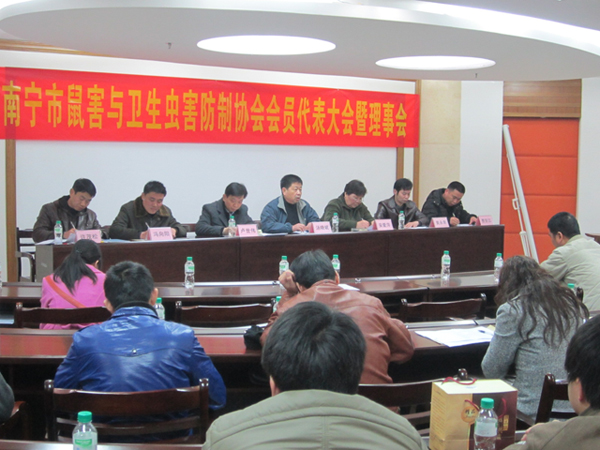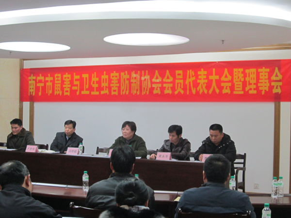2012年元月9日,南寧市鼠害與衛(wèi)生蟲害防制協(xié)會在南寧市衛(wèi)生局召開了協(xié)會理事及全體會員大會,會議審議并全體通過了協(xié)會工作報告、財務(wù)報告及新一屆協(xié)會領(lǐng)導(dǎo)選舉??祪艄究偨?jīng)理黃永幸先生當(dāng)選新一屆協(xié)會副會長。圖為南寧市衛(wèi)生局長湯曉斌、愛衛(wèi)辦常務(wù)副主任盧世偉、安愛萍會長(原南寧市疾控中心黨委書記)、愛衛(wèi)辦副主任許茂松(協(xié)會副會長)、副會長馮向陽(廣西自治區(qū)疾控病媒專家)、副會長黃永幸、秘書長費(fèi)百江在主席臺就座。
